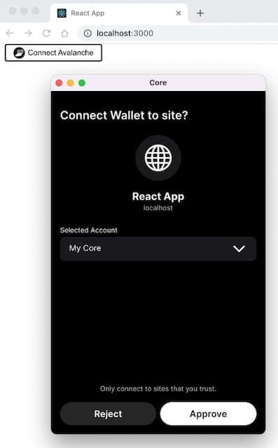 If everything works as expected, you should be able to load [http://localhost:3000/\] on your browser, click on the "Connect Avalanche" button on the page as below:
